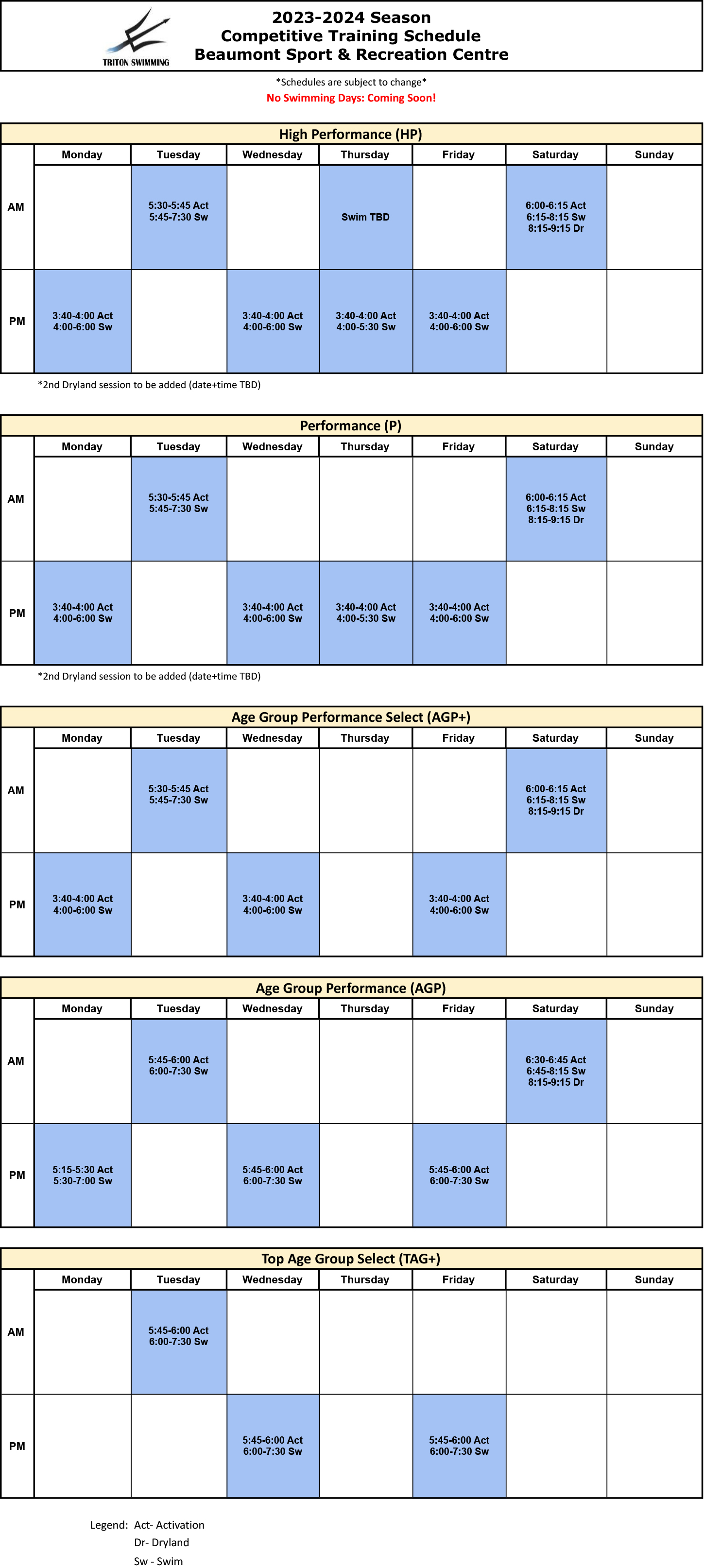 Triton Swimming COMPETITIVE TRAINING SCHEDULES